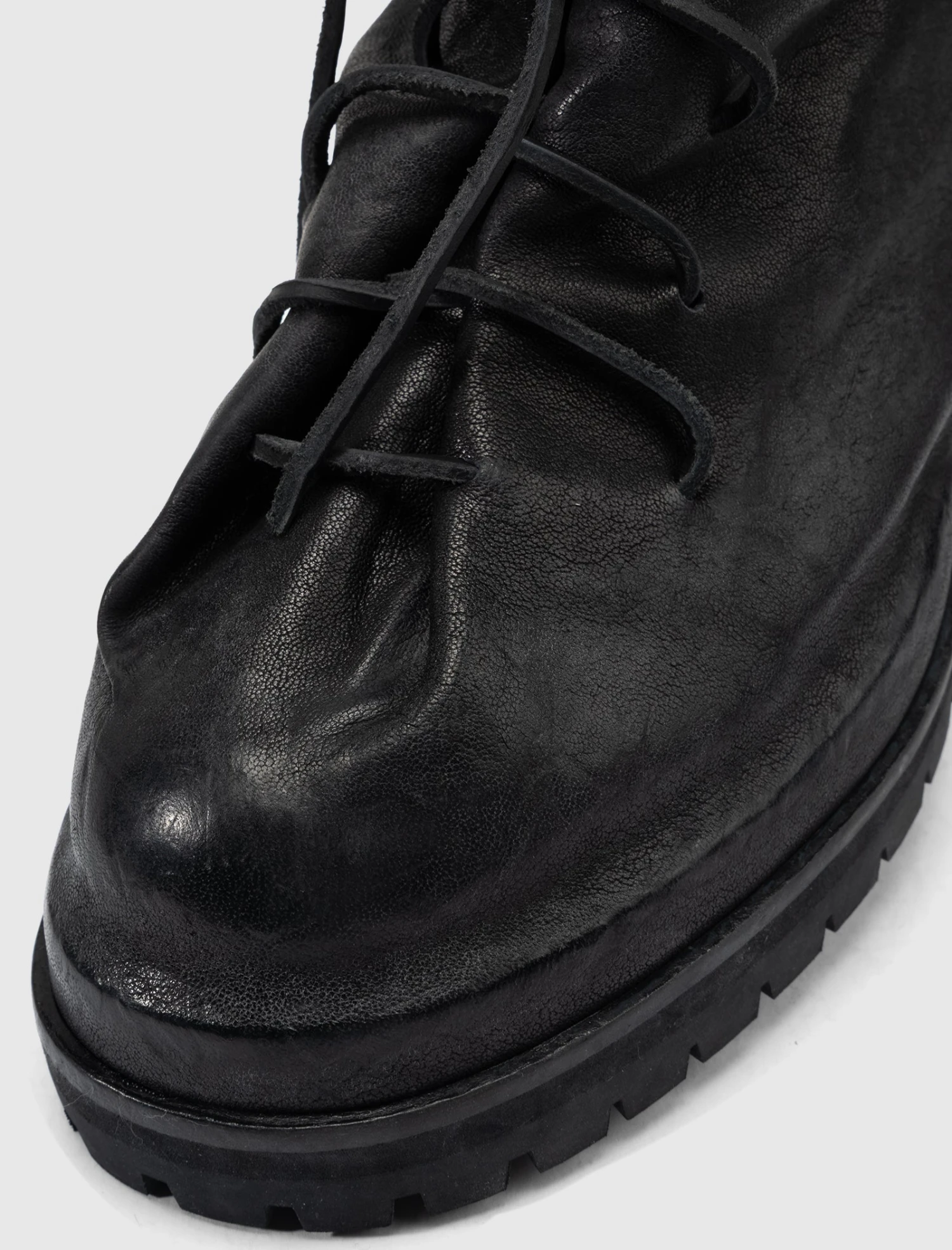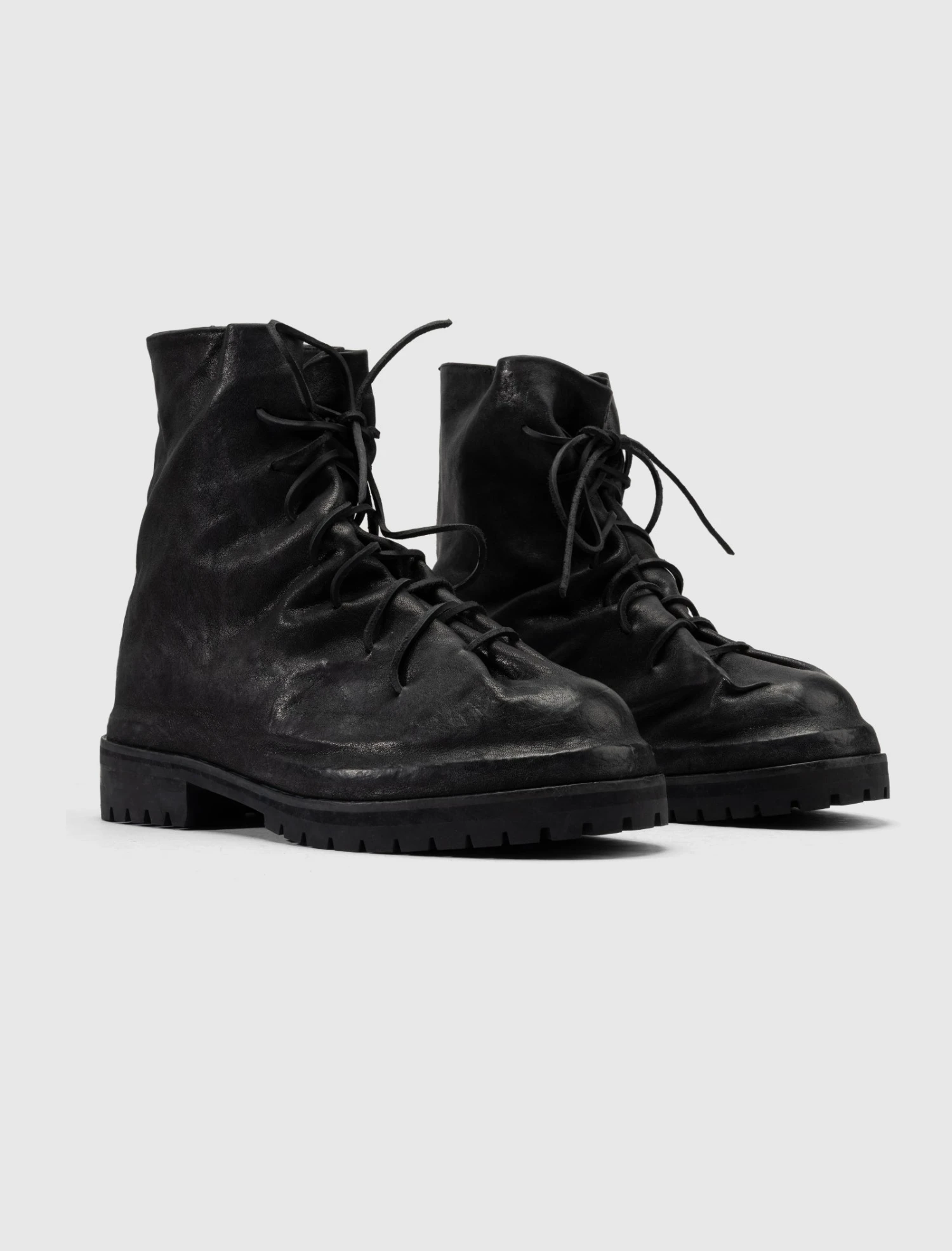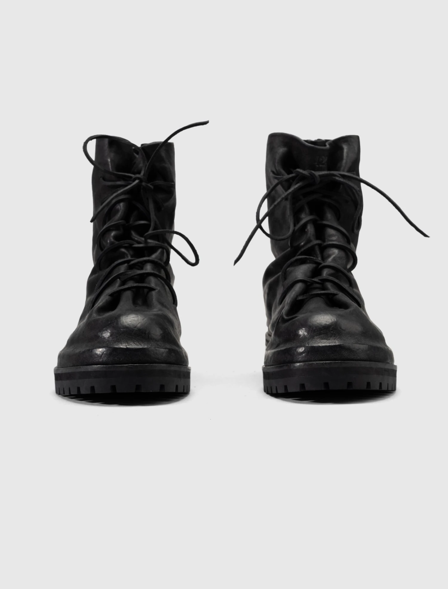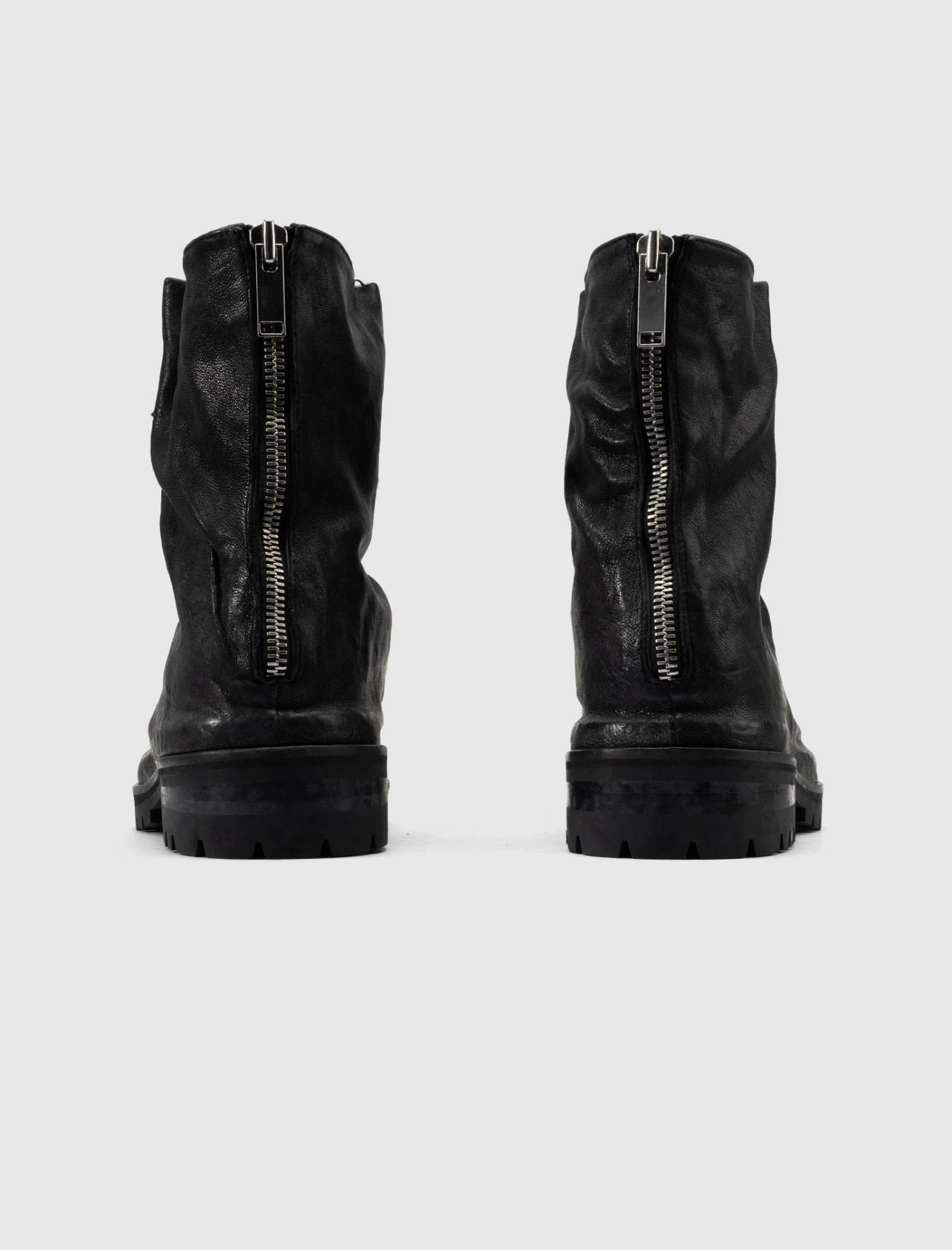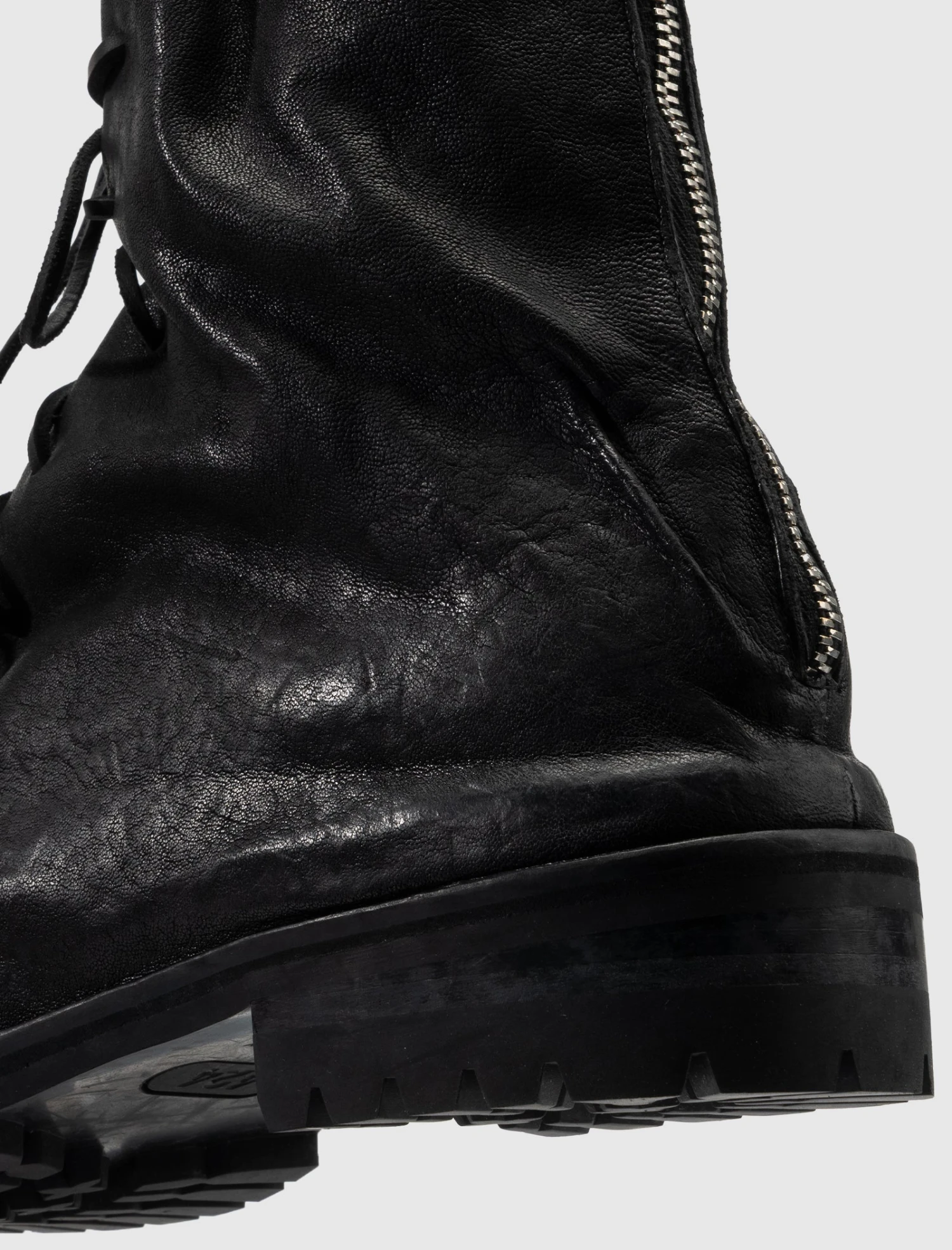 High top boot. Calf leather upper. Front lacing. Zippered back closure. Rubber lug sole.