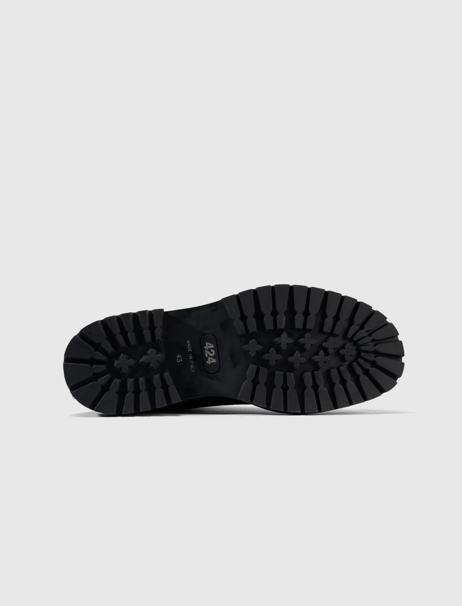 Nylon ankle boots. Round toes. Contrast leather panel detailing at back. Lug sole. Zip closure at back.