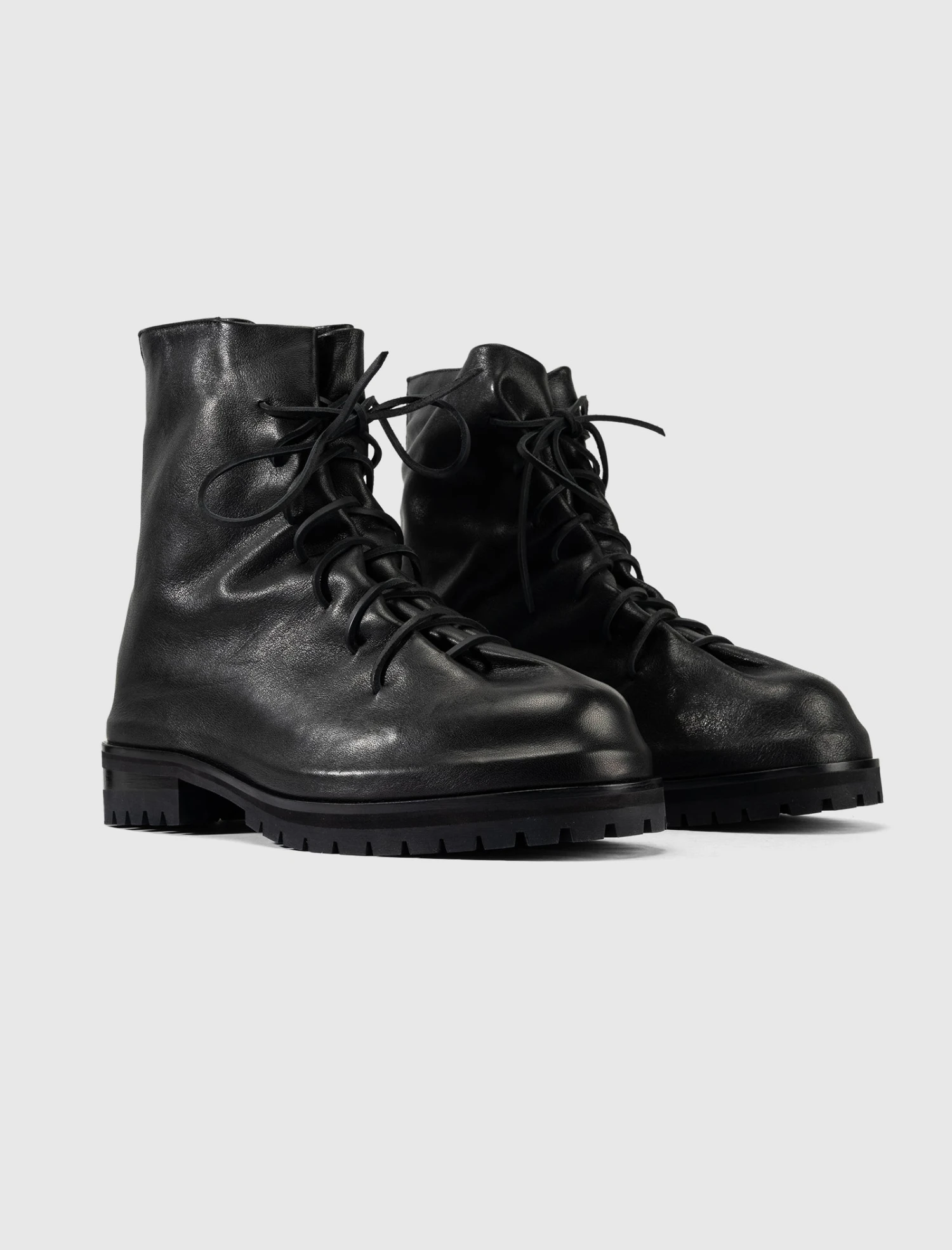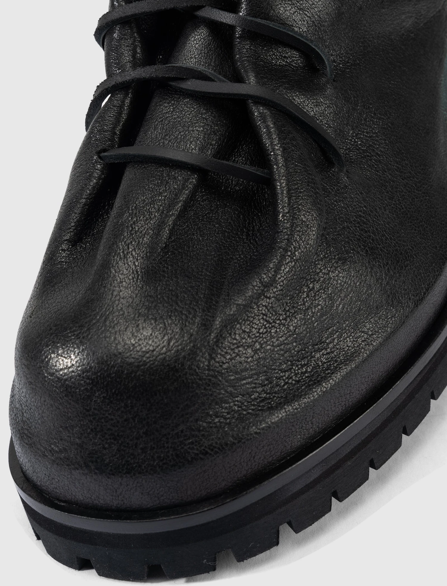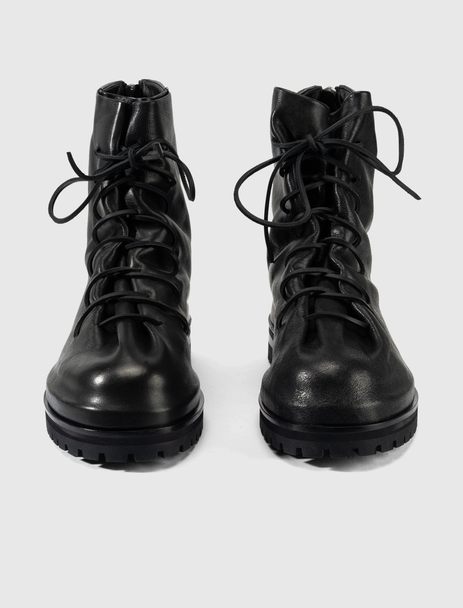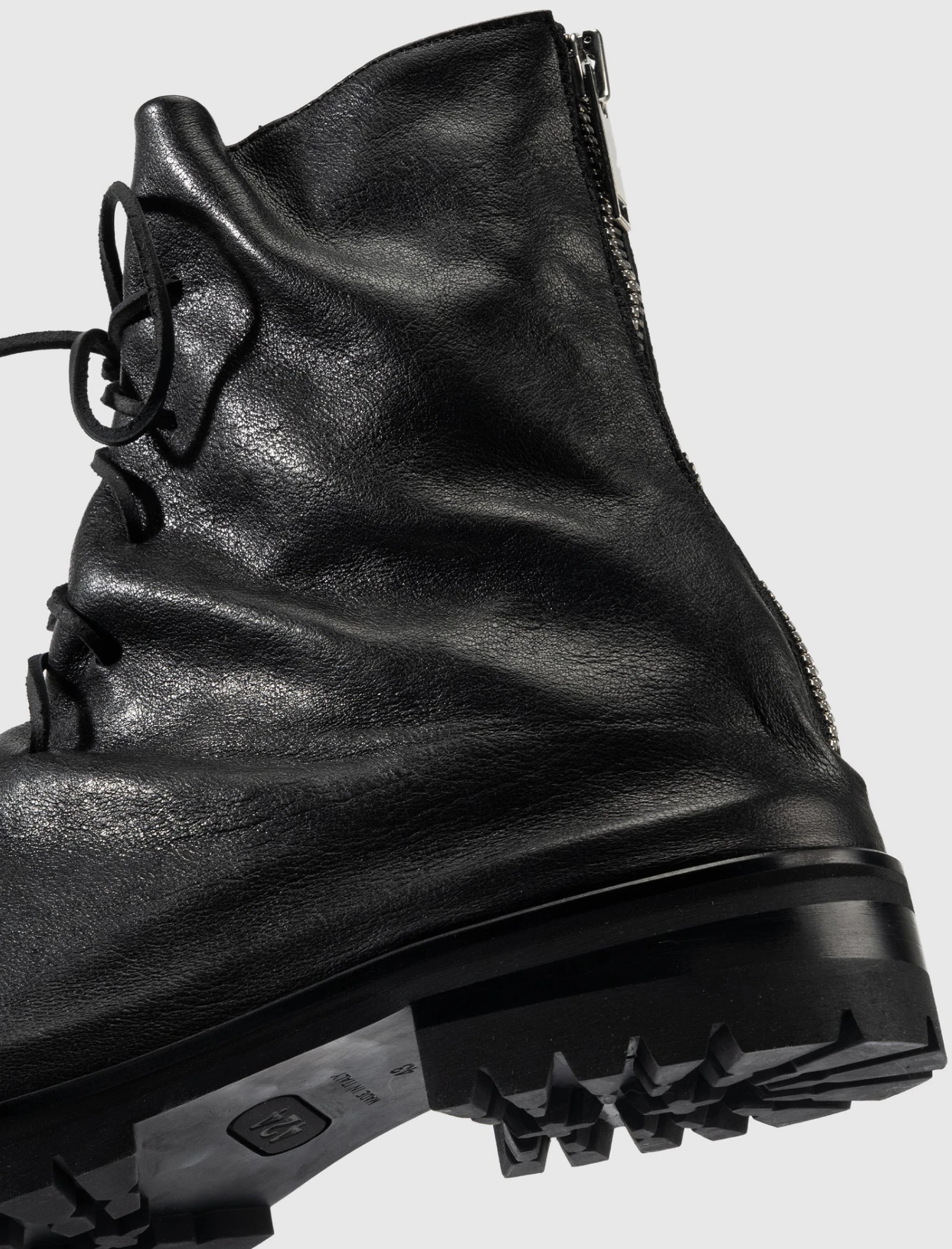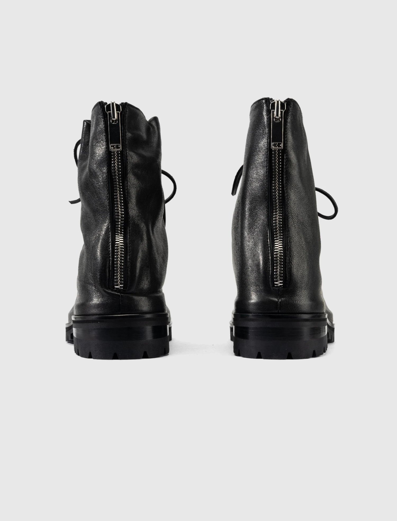 Leather ankle boots. Round toes. Rubber stacked outer soles. Silver-tone zip closures at counters. Lace-up fastening at uppers.