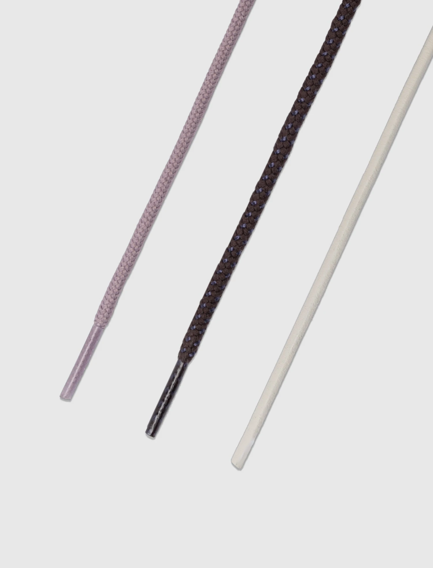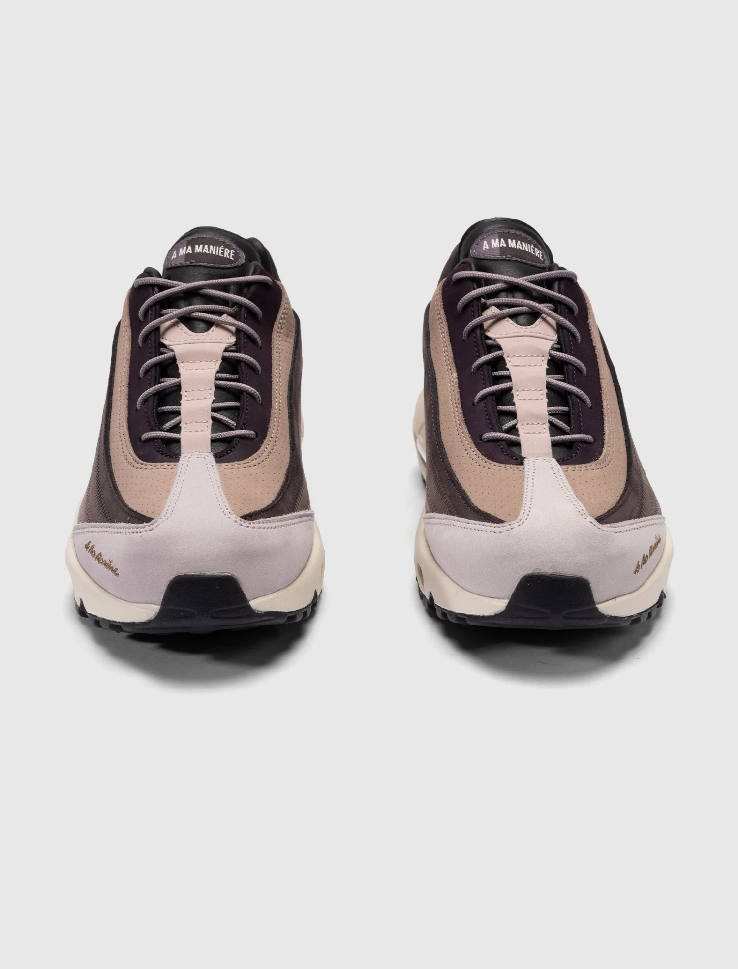 Low top sneakers. Smooth leather overlays around the toe box, eyelet panels, and heel counter. Fine suede overlays stacked on premium suede side panels. Precision laser-etched A Ma Ma Maniére branding on the outside heel and toebox. Leather tongue with a suede motif patch stitched at the center. Front lacing. Reflective 3M accents on the heel and tongue. Jacquard monogram satin tongue liner in grey. Monogram cushioned premium insole. Composite foam black midsole with mauve accented exposed air units. 3 alternate lace options included.
