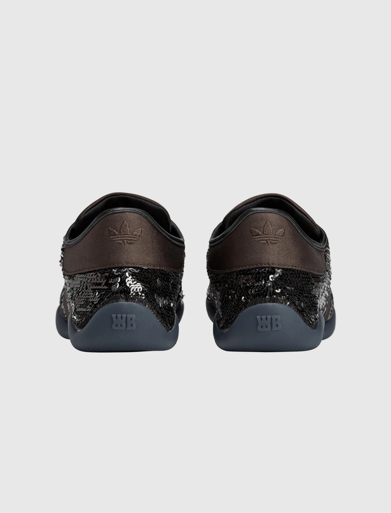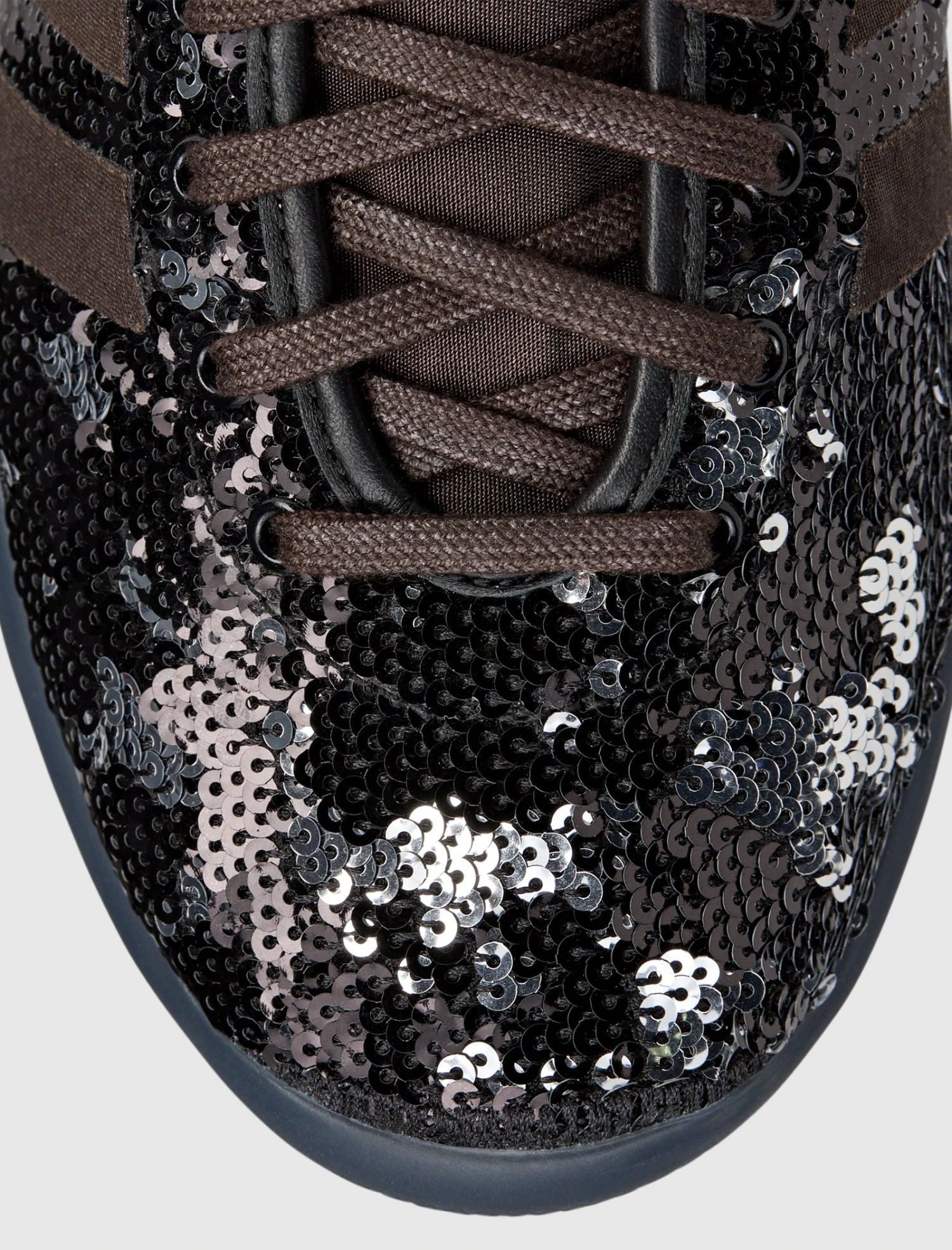 Low top sneakers. Sequined upper. Front lacing. Padded textile tongue. Logo stripe motif patches stitched on the side panels. Low profile rubber outsole.