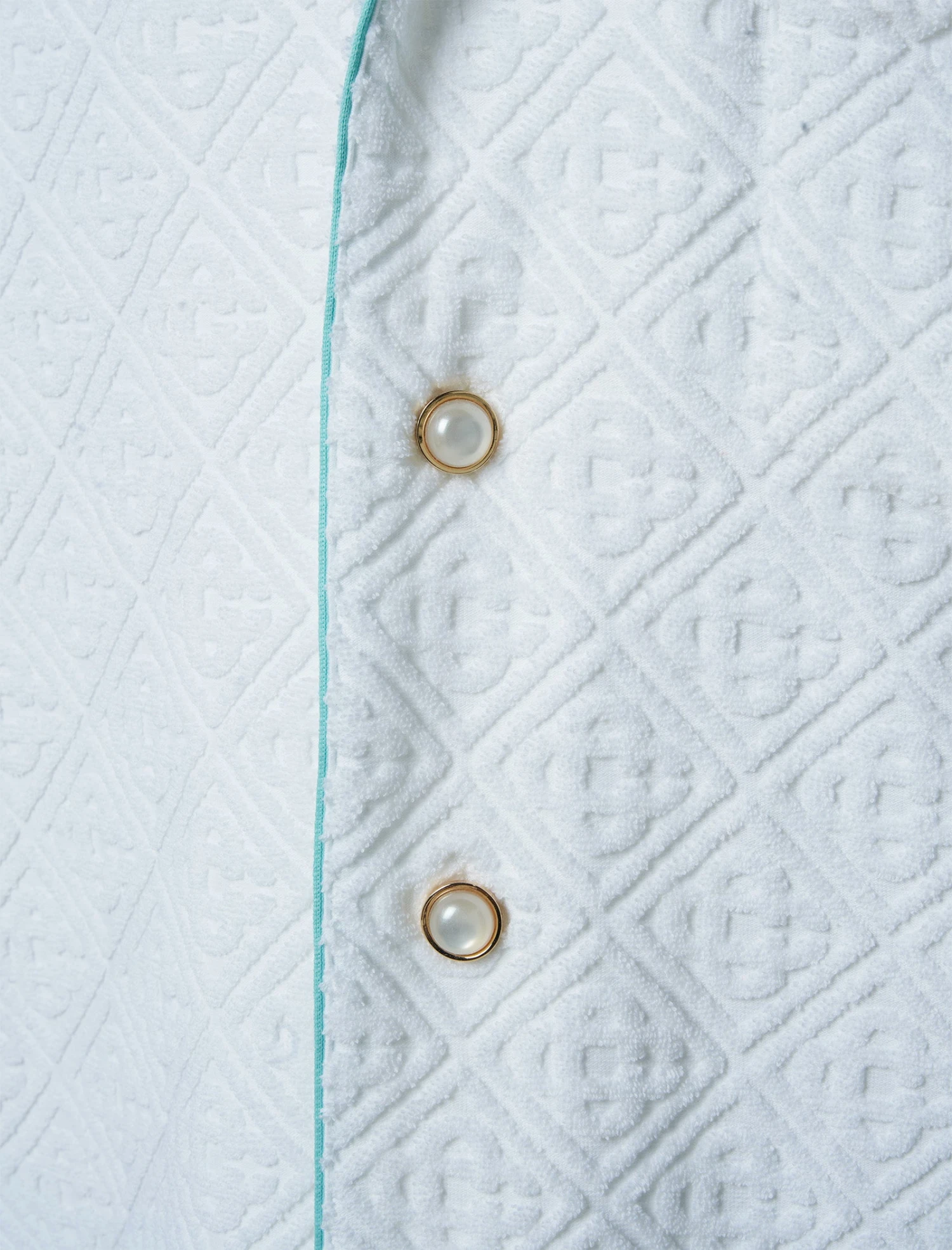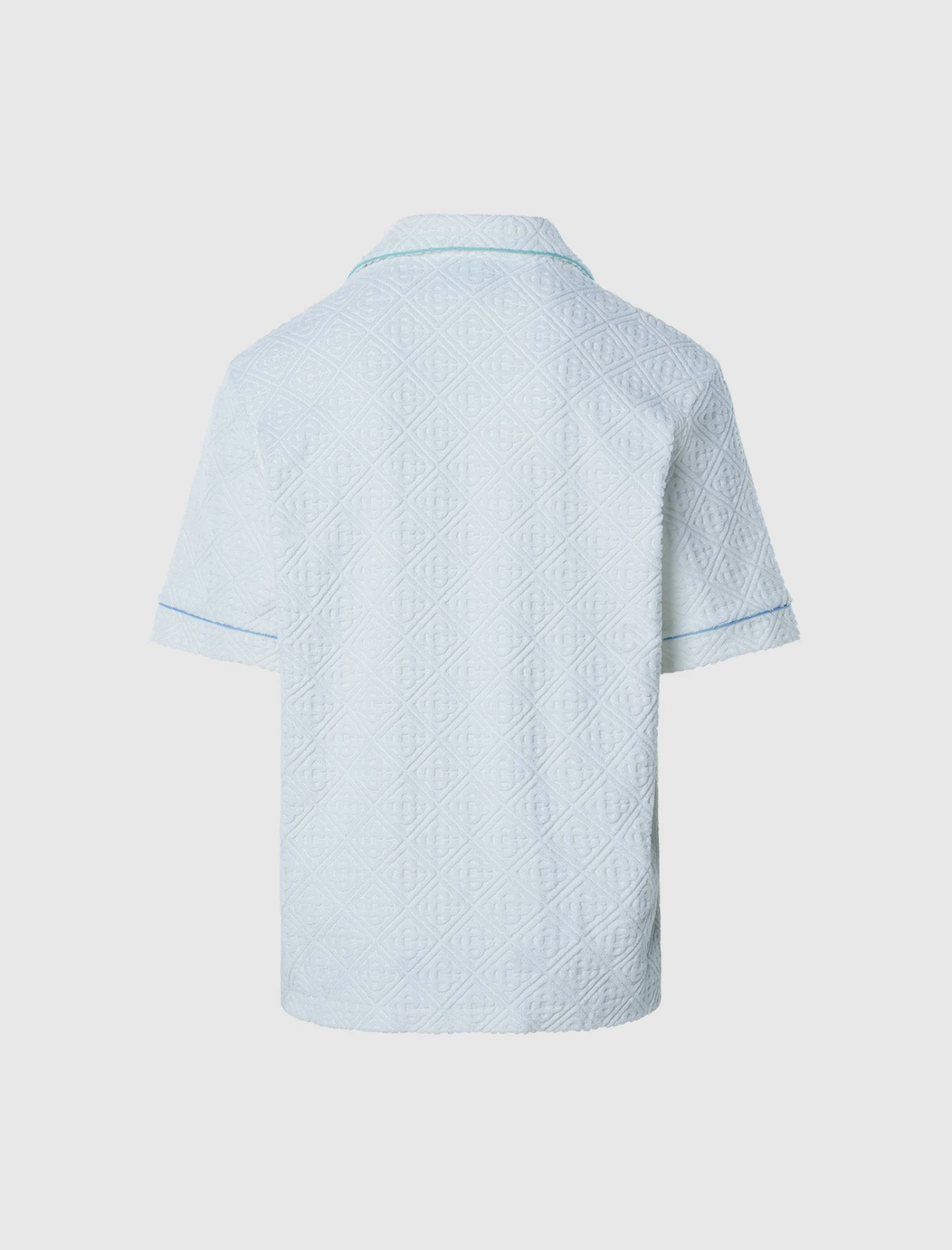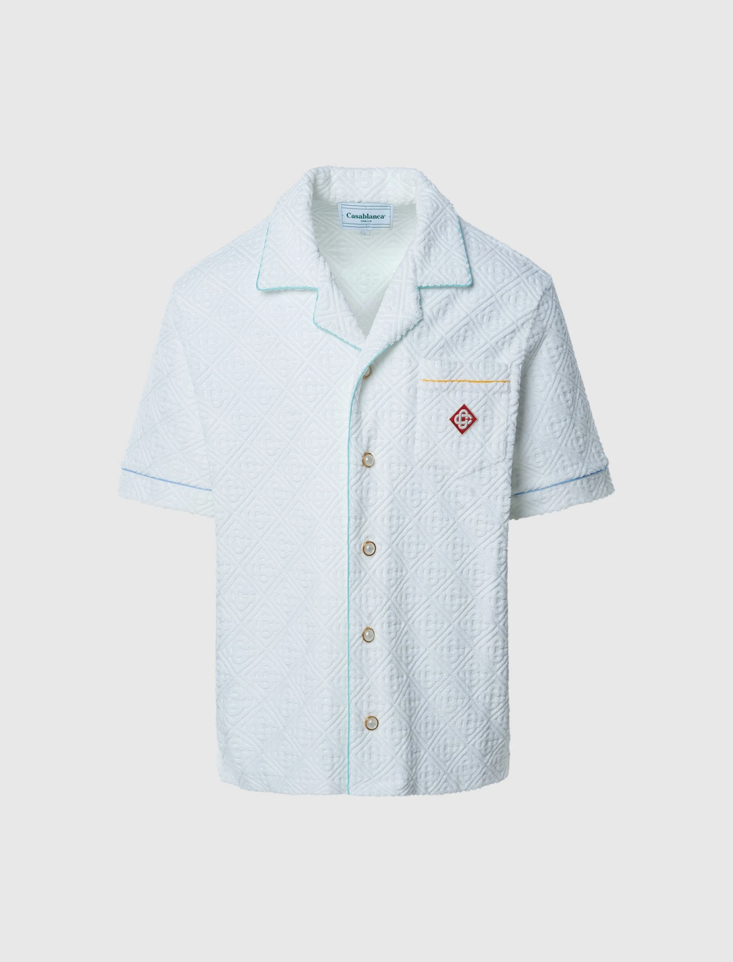 The Casablanca monogram towelling shirt is a short-sleeve design made from a cotton blend towelling fabric and accented with the house’s iconic diamond logo. It boasts a breast pocket, front button closure, and signature gold rim pearl buttons, along with contrasting colors on the collar, placket, sleeves, and pocket for added edge.