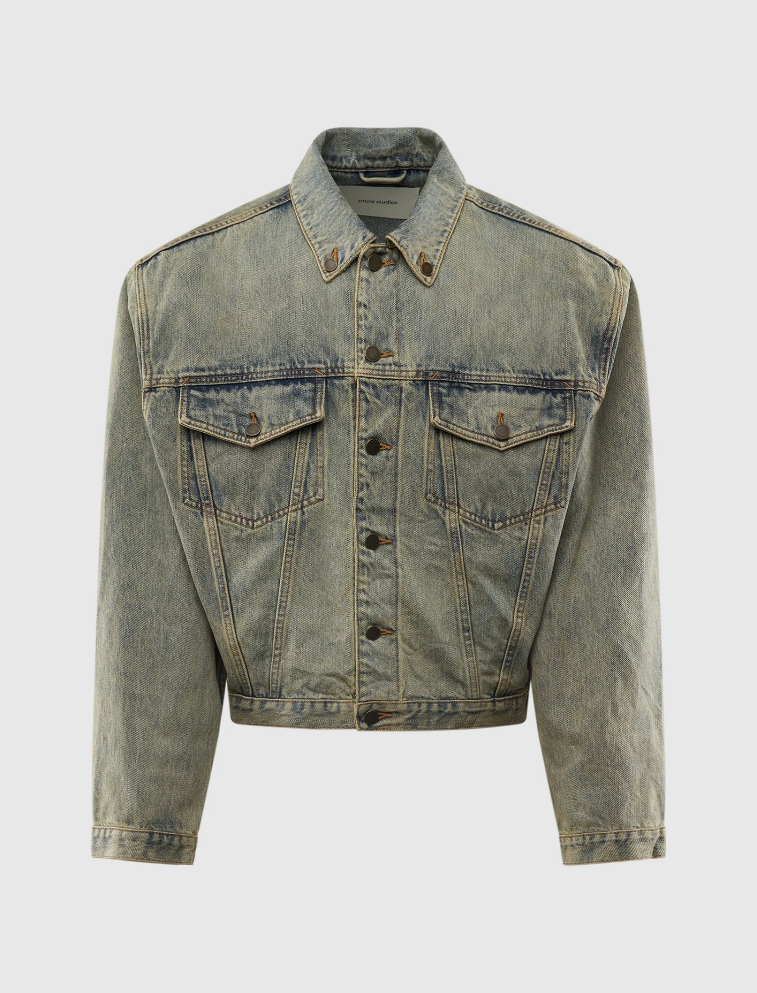 The Entire Studios Shrunken Denim Jacket blends vintage edge with modern tailoring. Featuring a cropped, structured fit and a unique washed finish, it’s the perfect layering piece for effortless style. A versatile staple that adds character to any look.