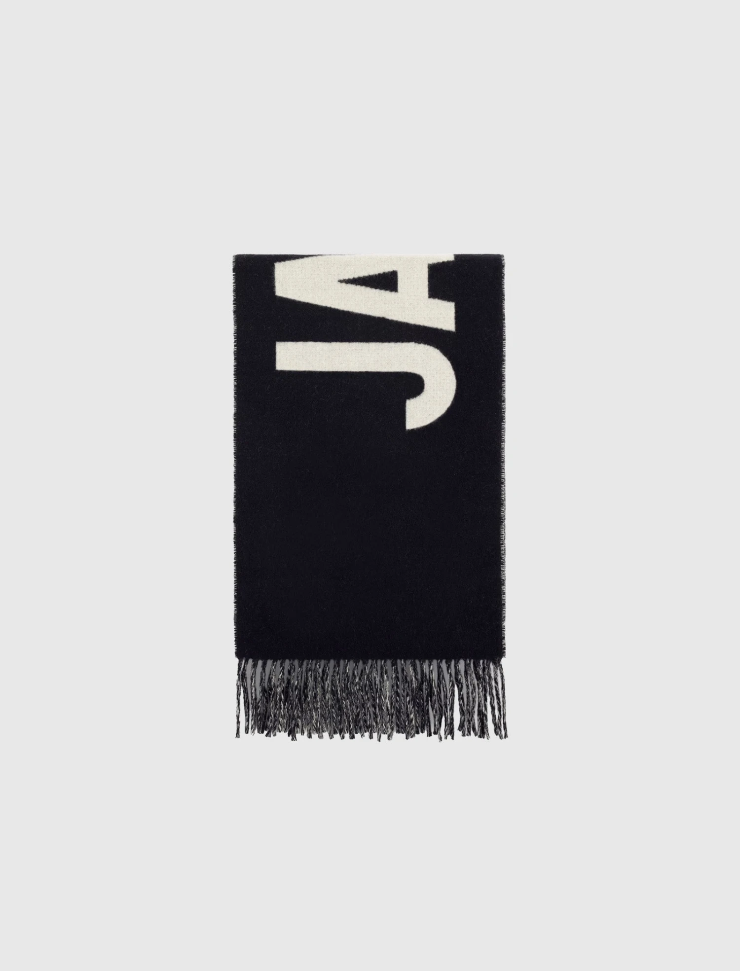 Merino wool scarf. Jacquard logo motif knitted across horizontally. Loose yarn accents.