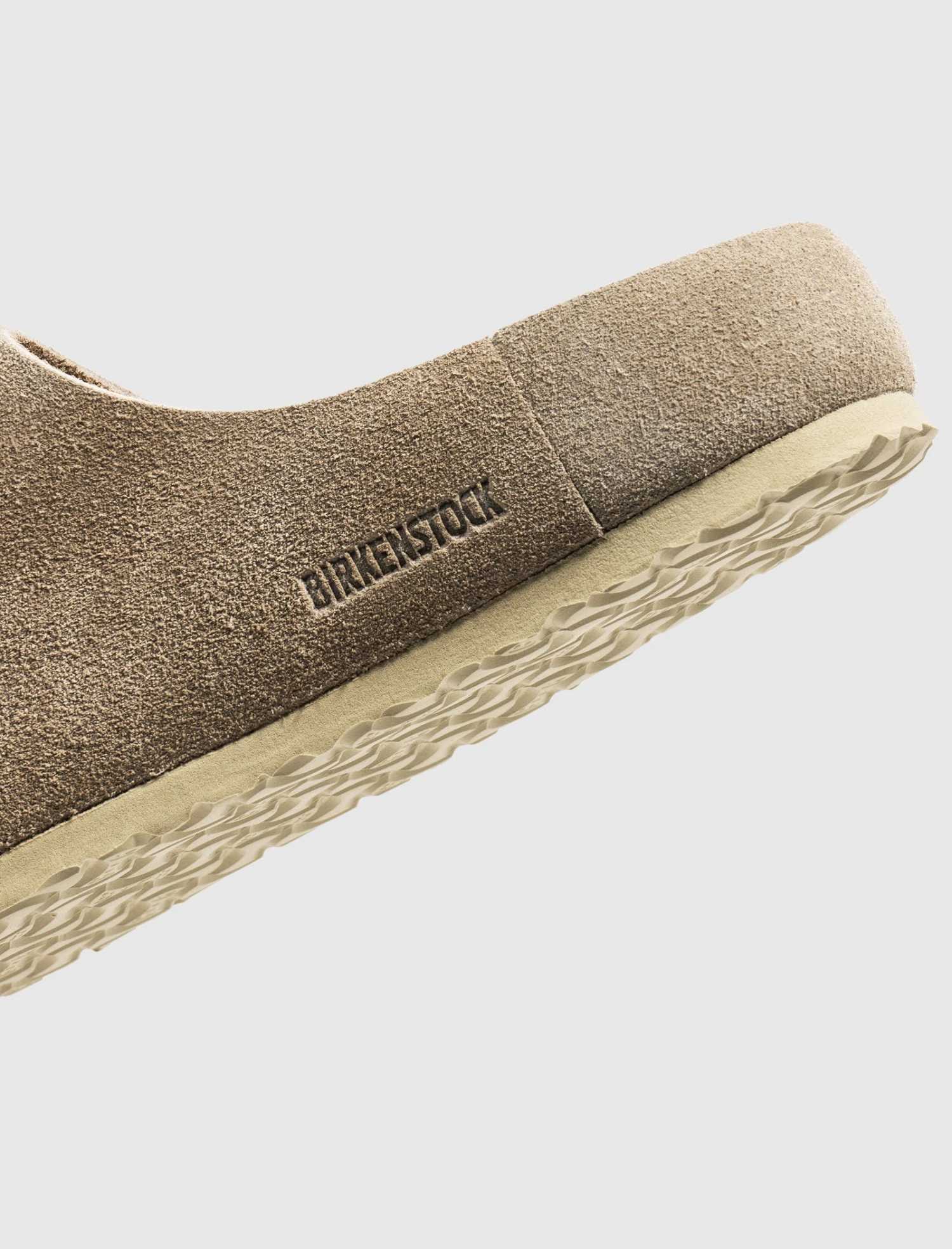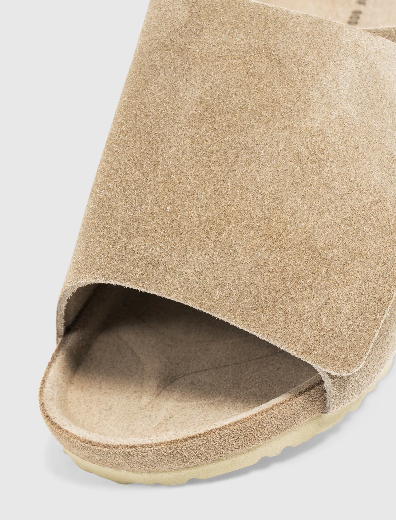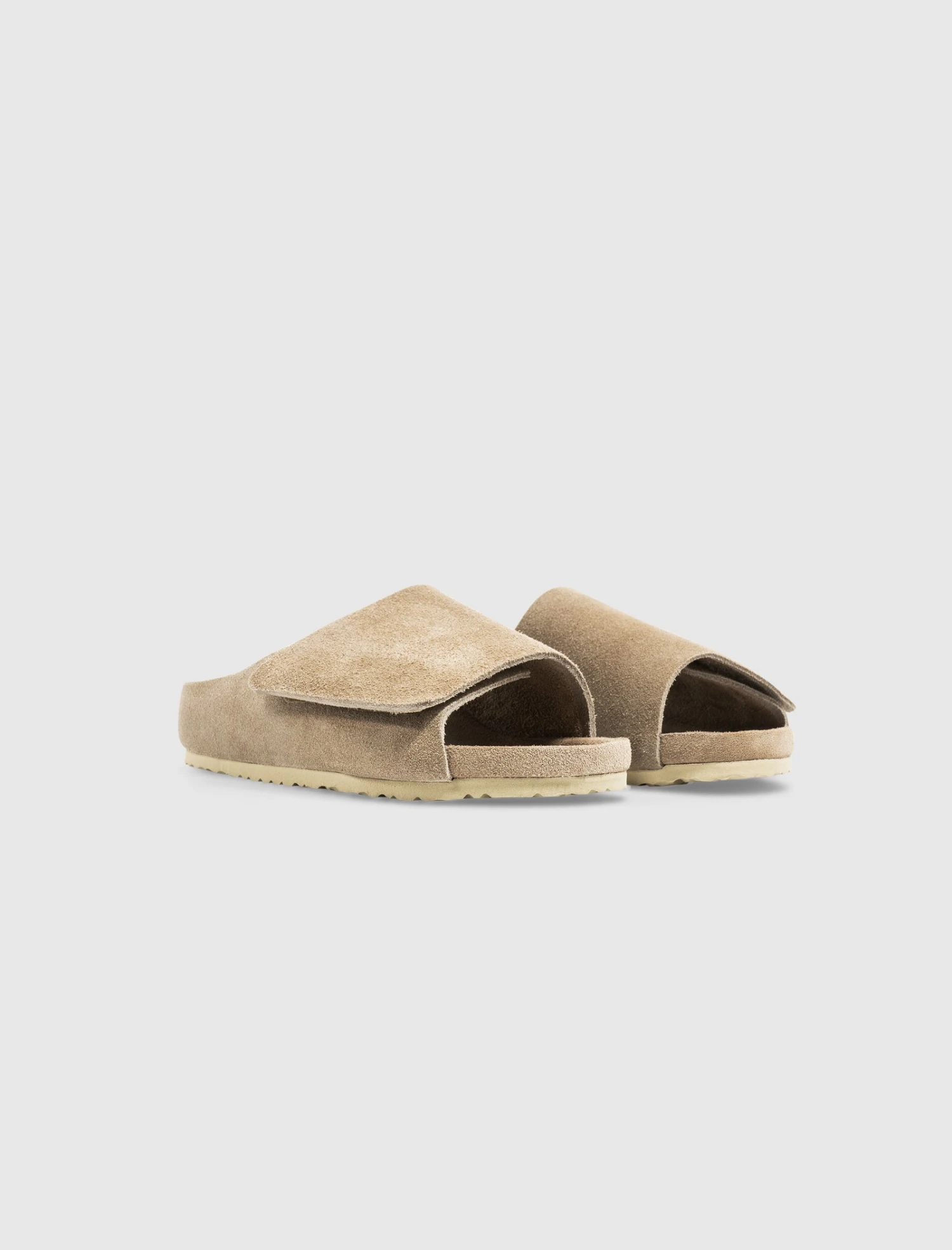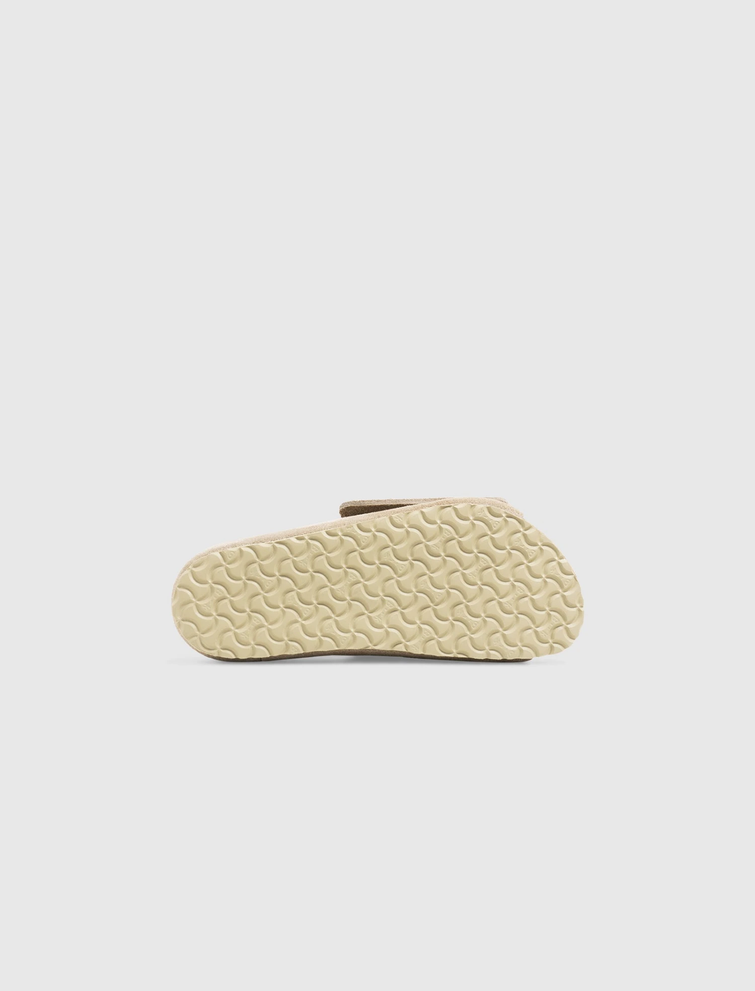 Slip on Suede slides. Molded suede footbed. Suede top strap. Translucent rubber outsole.
